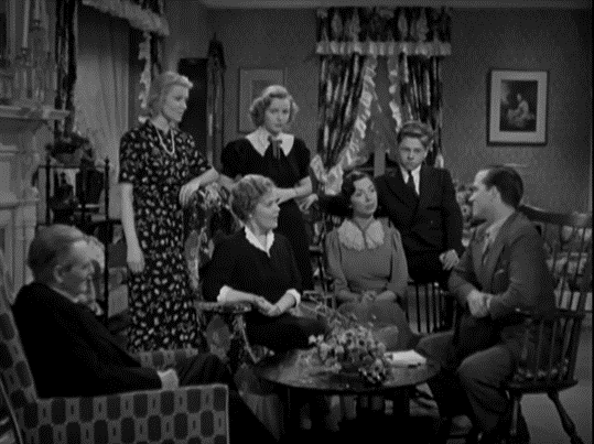 The film was, on the other hand, unambiguously celebratory of the nuclear family. Judge Hardy’s home and his relationships with his wife and children were characterised throughout as a necessary haven from the burdens of professional and public life. At the same time, the film drew strong connections between his qualities as a judge and as a father: patient, moral (but not moralising), and concerned above all with the welfare of those in his charge. As with the law, his approach to childrearing lay in a faith in timeless principles that would win out if given the time to. Yet the film also made it clear that the things Judge Hardy wanted for his children, and that they told him and his wife Emily that they wanted for themselves, were threatened by the same growing social and economic complexity that challenged conservative approaches to law and administration. Joan’s marriage was jeopardised by the ‘fast’ crowd she and Bill had fallen into, exemplified by the roadhouse where he had seen her being kissed by another man, which also stood in more generally for commerce shorn of morals. Meanwhile, as Marion pointedly complained to her father, career opportunities were far less readily available to her generation than his, and hence his blocking of the aqueduct project made it far likelier than Wayne would have to move on in search of work, jeopardising their own engagement. A Family Affair took the laments of the adult Hardy children seriously. However, it resolved them through their father’s successful renomination as district judge, his legal and political victory creating the necessary conditions for their reconciliation with their own romantic partners.